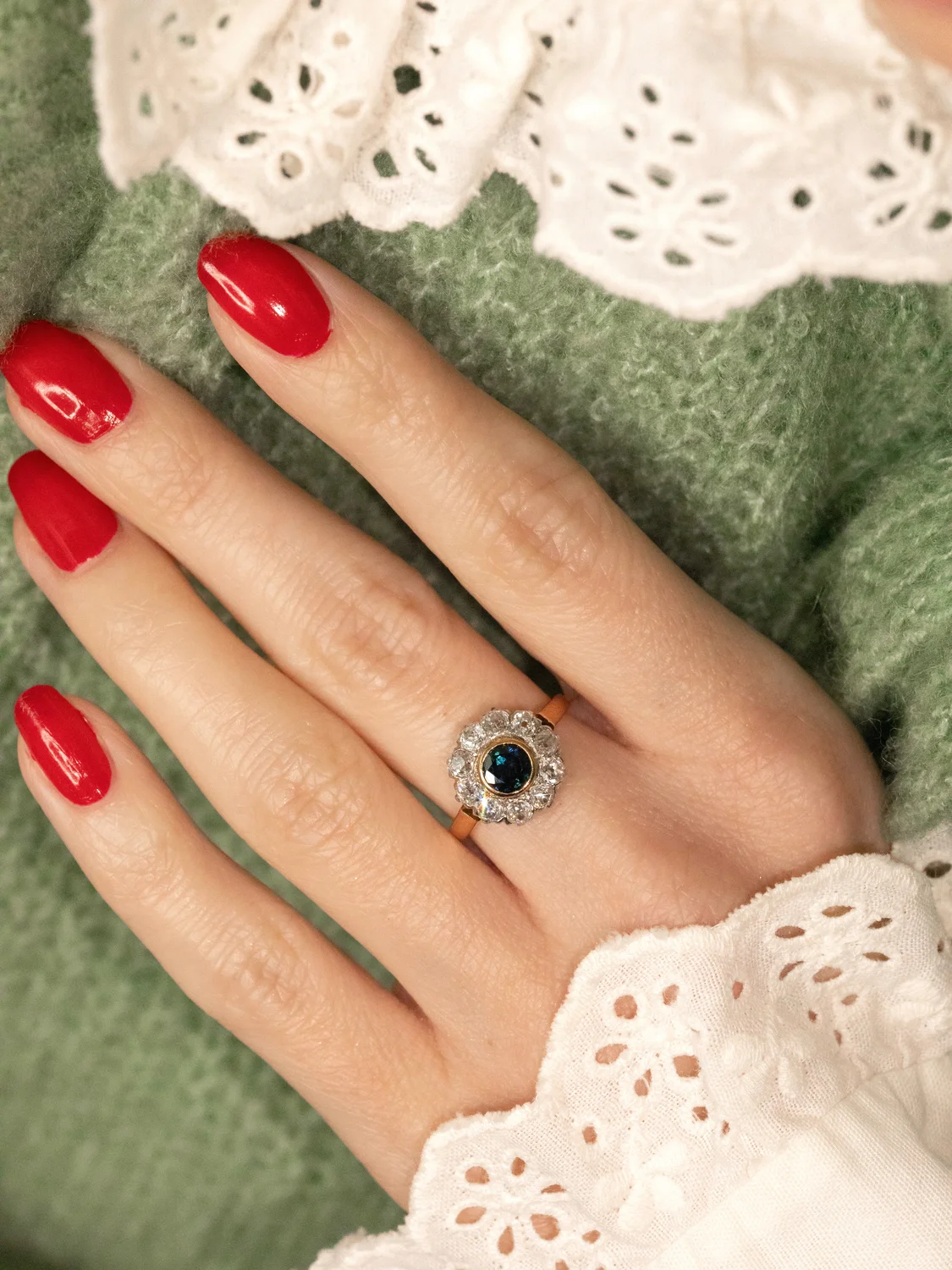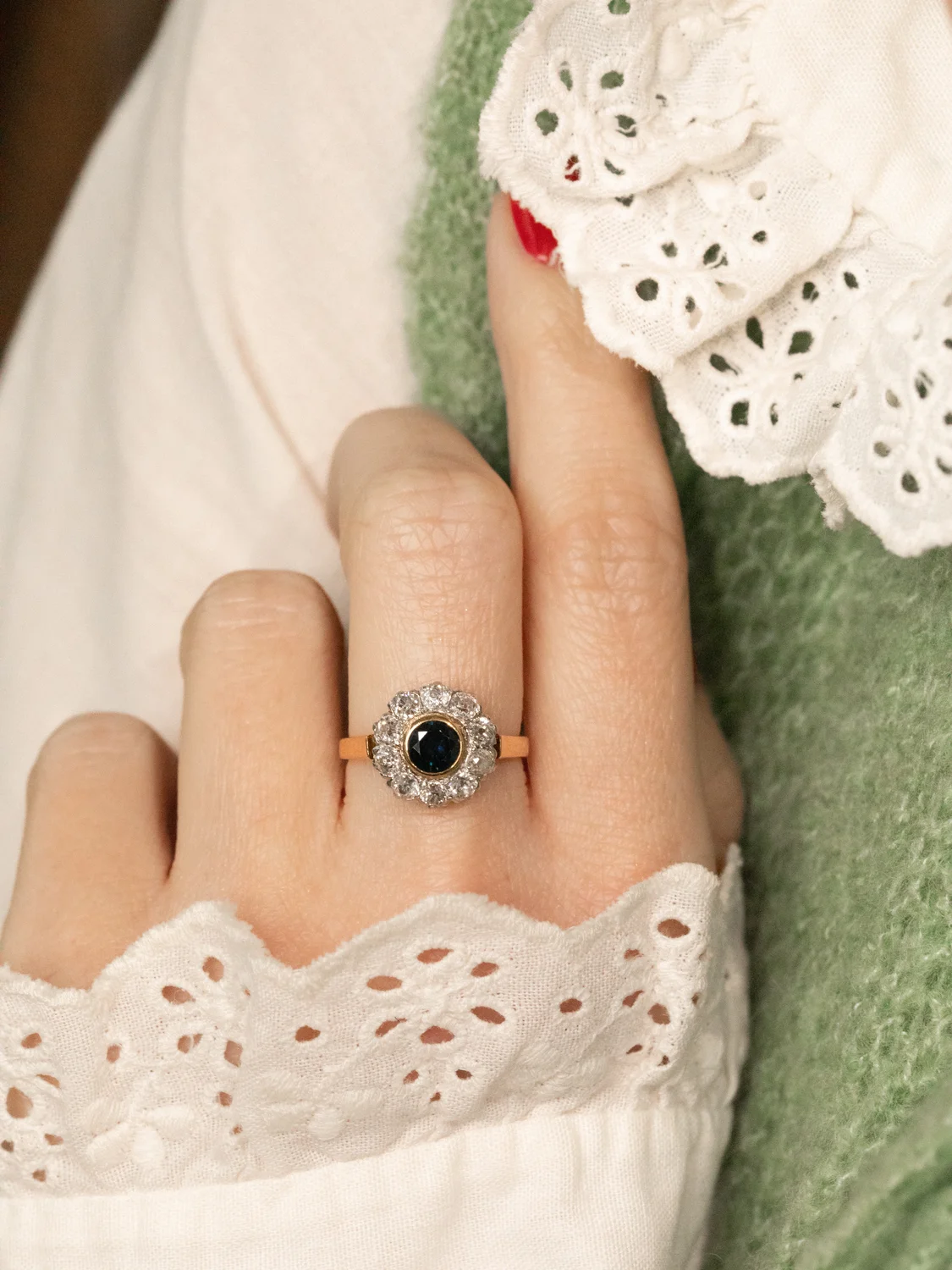 En son cœur, un sublime saphir en serti clos, d’un bleu profond et velouté, capte la lumière avec une intensité presque hypnotique, rappelant le ciel d’un crépuscule étoilé. Tout autour, dix diamants scintillants de taille ancienne (totalisant environ 1,00 carat) forment un halo étincelant, tel un éclat de rosée posé sur les pétales d’une fleur précieuse. Leur éclat dansant vient sublimer la profondeur du saphir, créant un jeu de lumière fascinant entre ombre et clarté.