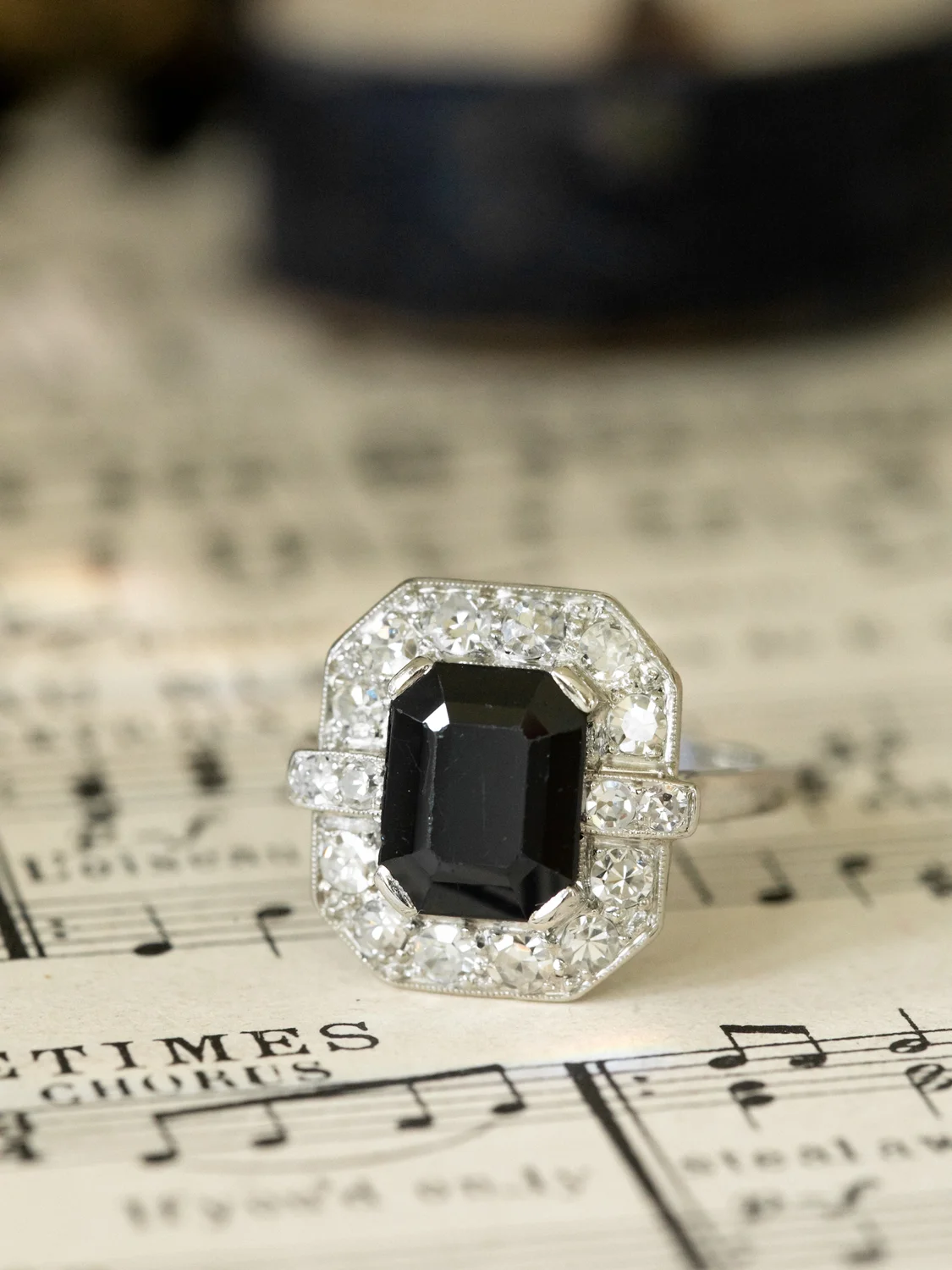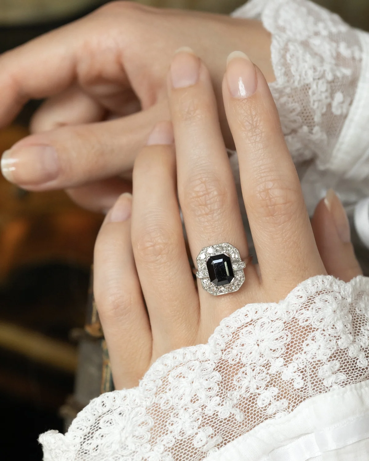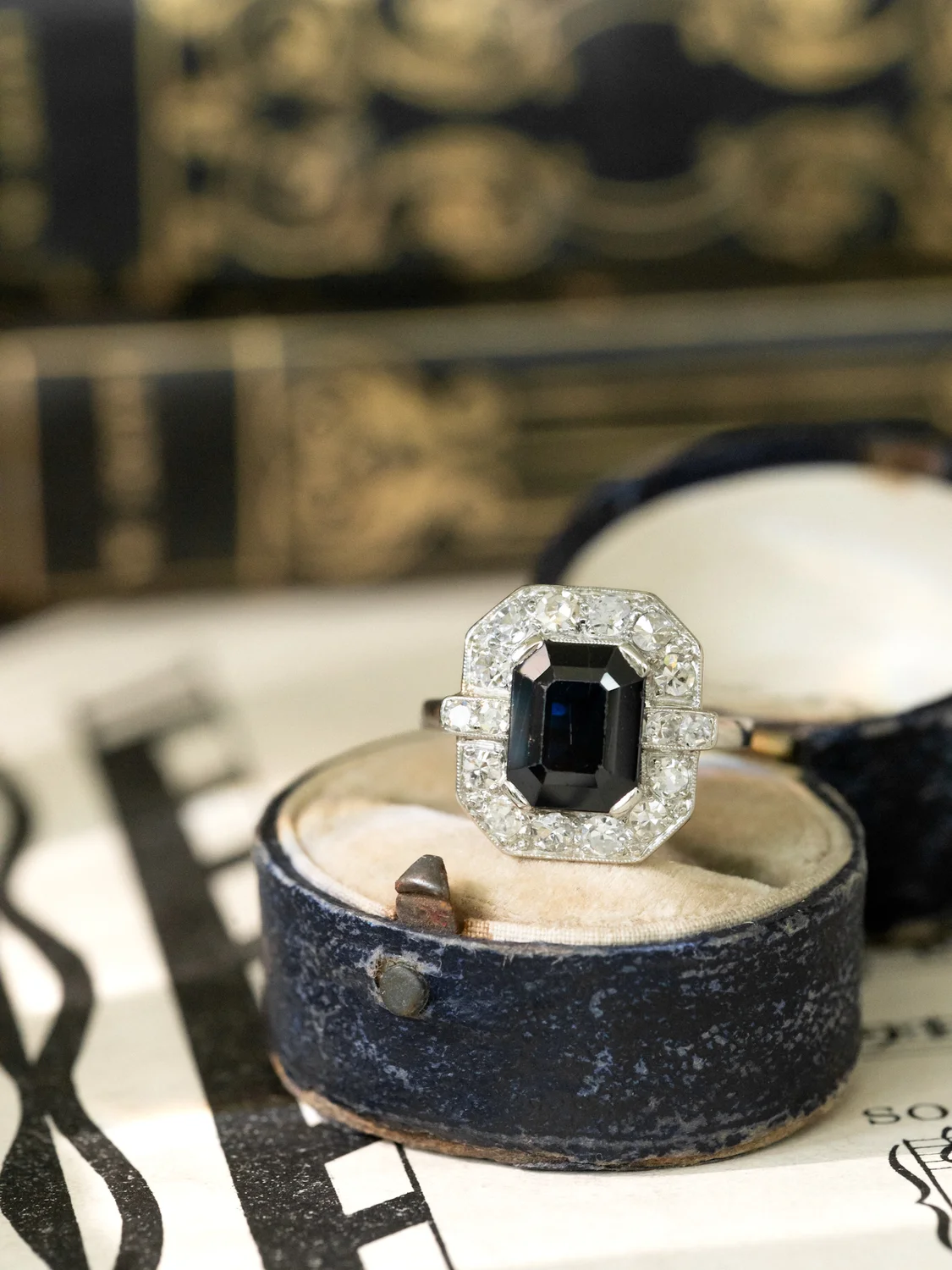 LA PAULINE, merveilleuse bague octogonale ancienne Art Déco (circa 1930) en platine, saphir de minuit 2,1 ct et diamants scintillants ✨